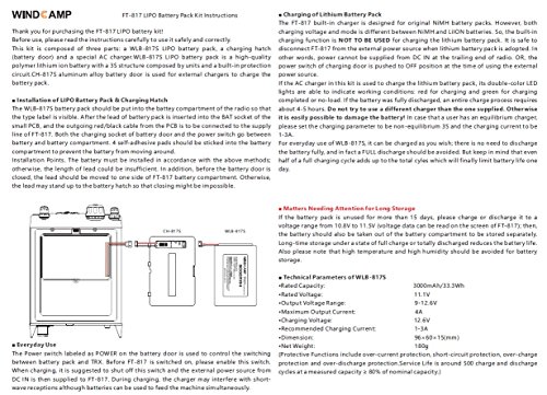 The FT-817 built-in short-wave reception is designed for original Ni-Mh battery packs. As their charging voltages and modes are both in nonconformity with WLB-817S, their built-in charging function is forbidden from charging the lithium battery pack. It is safe to disconnect FT-817 from the external power source when lithium battery pack is adopted. In other words, power cannot be supplied from DC IN at the trailing end of radio. OR, the power switch of charging hatch is pushed to OFF position at the time of using the external power source.
